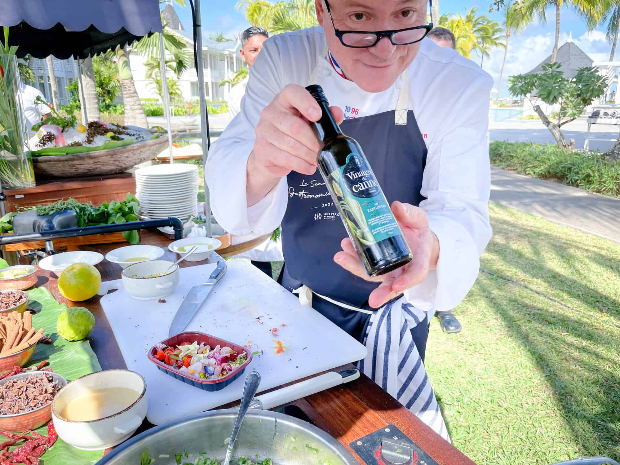 Heritage Le Telfair Chef Jocelyn Argaud also led cooking classes, talking about local produce and ideas and walking us through the creation of a palm heart salad.