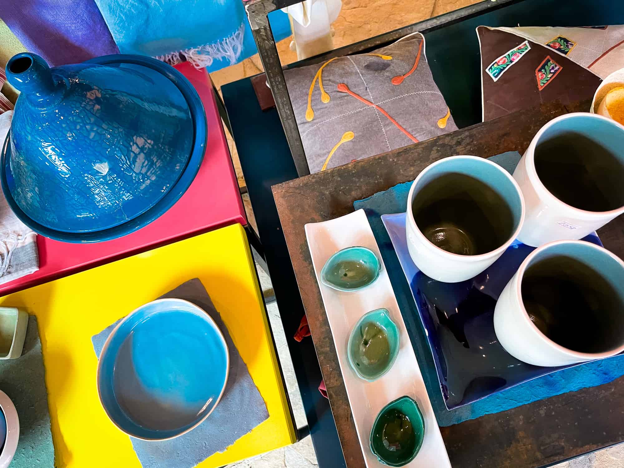 Beautiful ceramics at the Iraq Al Amir Women’s Cooperative – display of colourful ceramic objects for sale