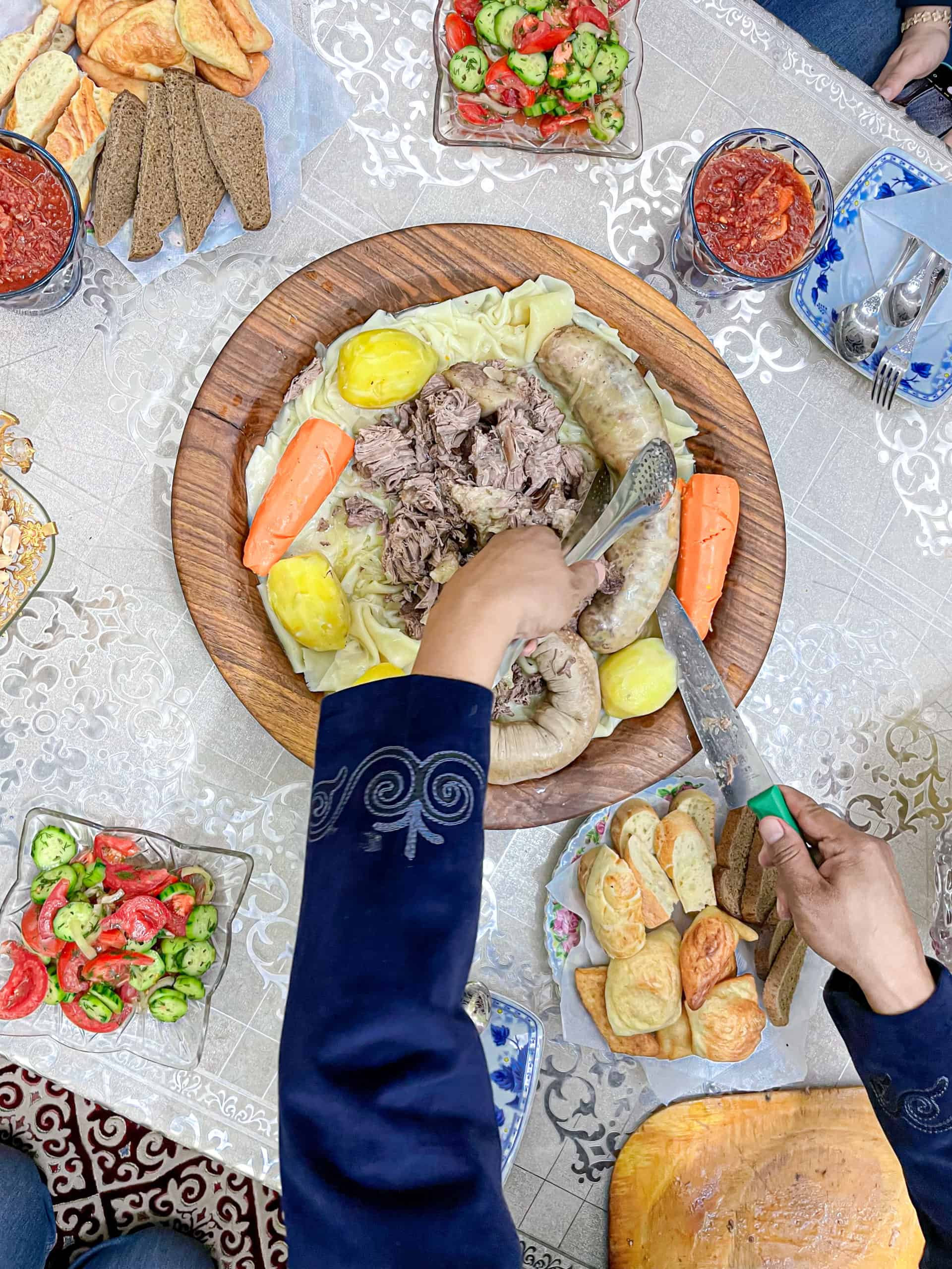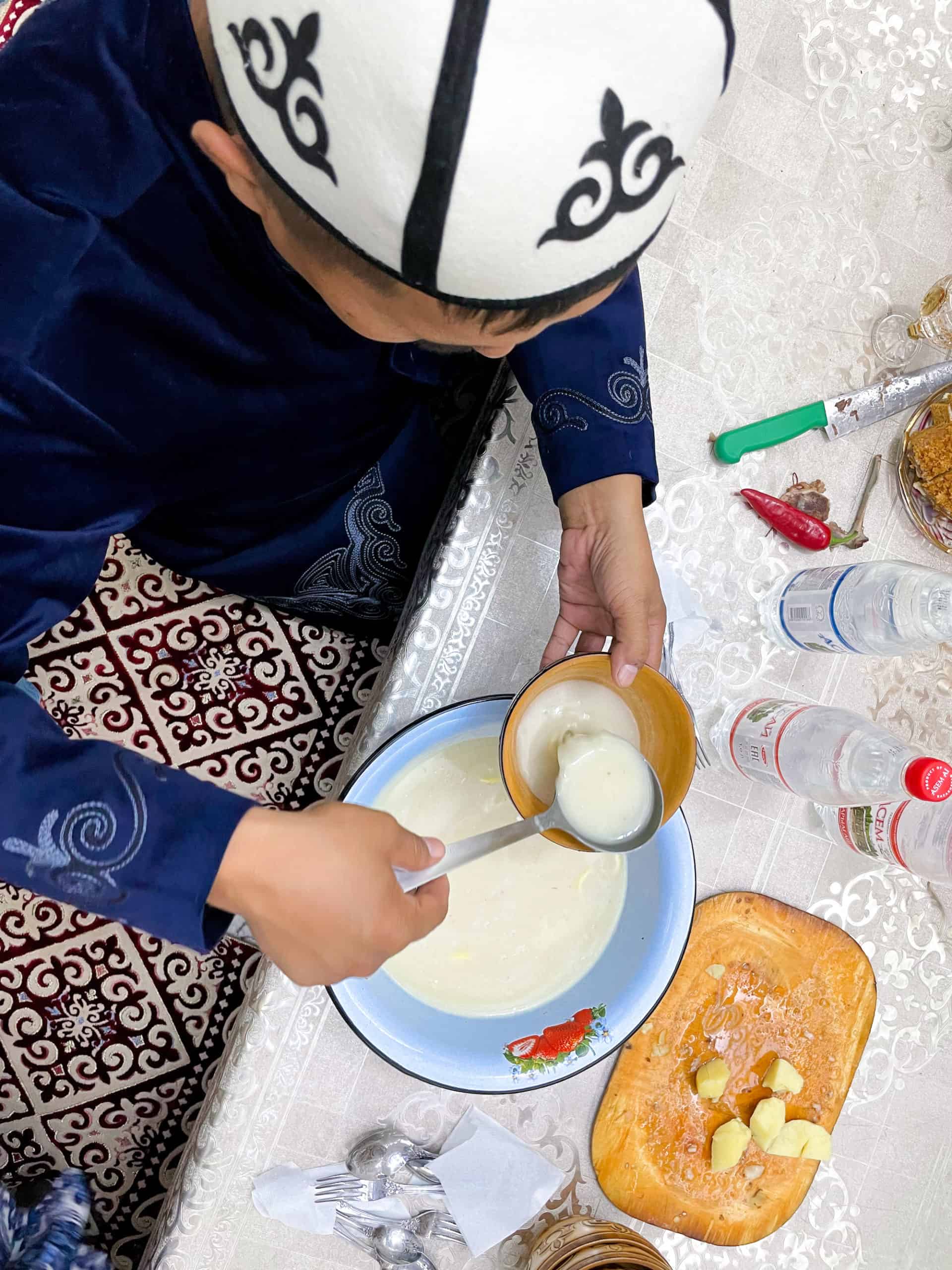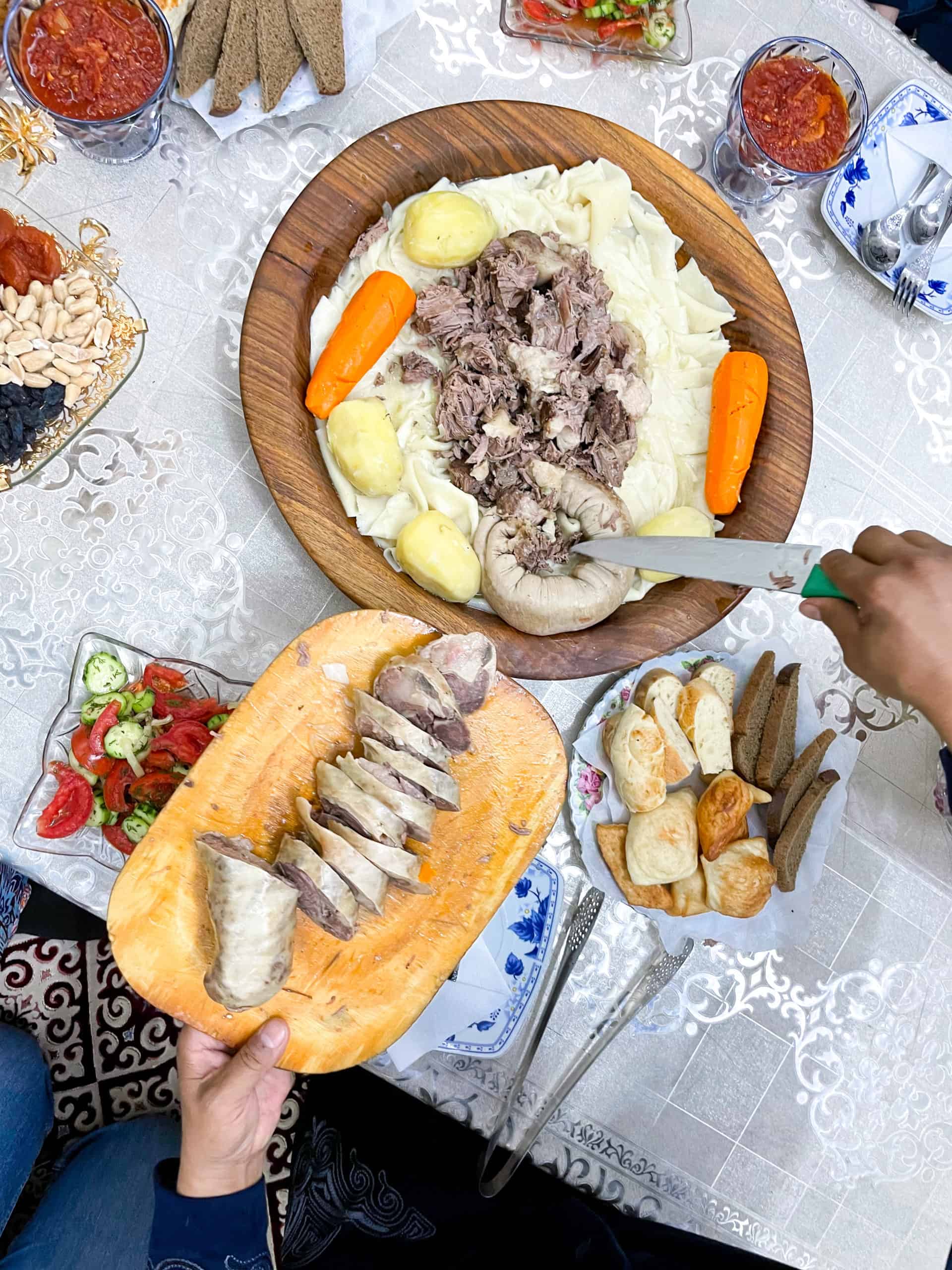 Served in beautiful kese bowls, the appetiser involved shorpo, a light and salty mutton broth. After the main beshbarmak, sliced up by the host and dvided into portions, we received ak-serke broth. This comes with kumis, a fermented camel milik drink, along with a slice of lemon. The aim is to settle the stomach after all that meat, but as someone with lactose issues, I sipped as slightly as politeness allowed.