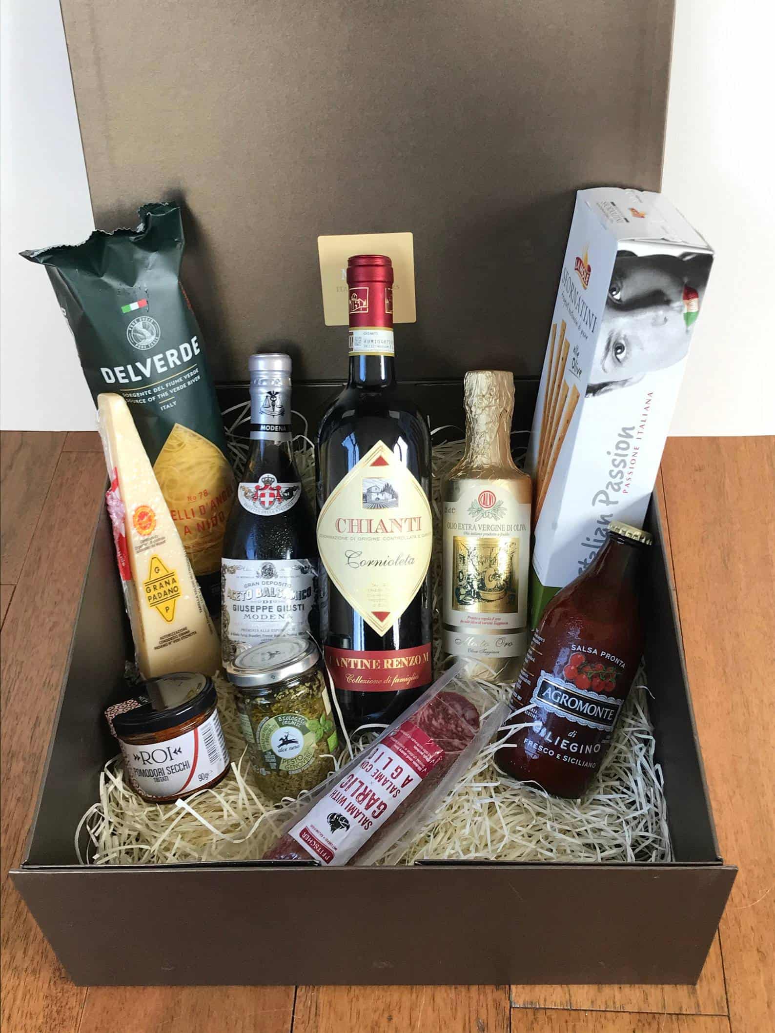 - Here’s a ready made Italian themed gift basket you can buy on Amazon and here’s a gourmet Italian hamper from Delicario.