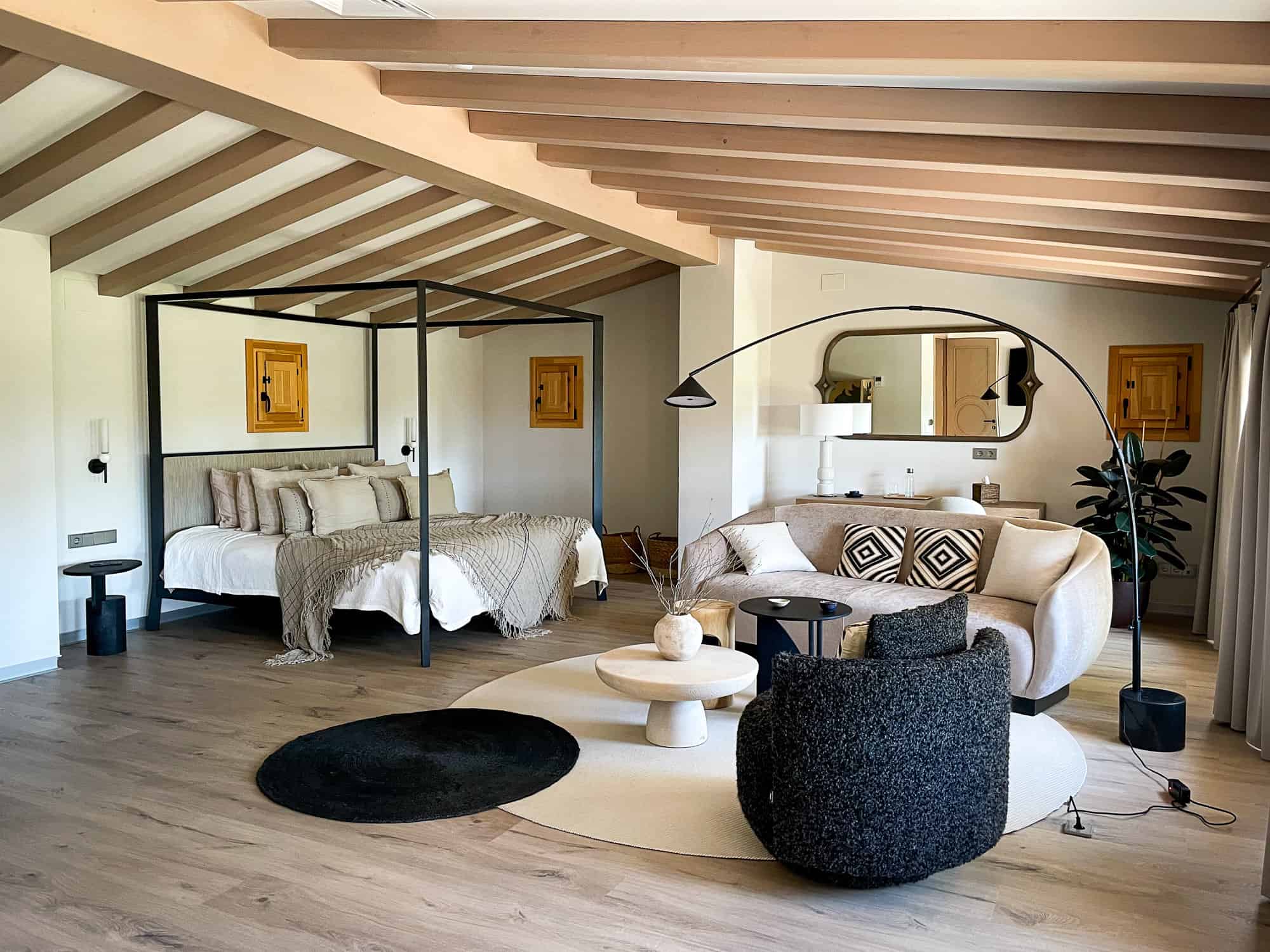 The master bedroom at Masia Cabellut, a luxury villa near Barcelona with a private pool