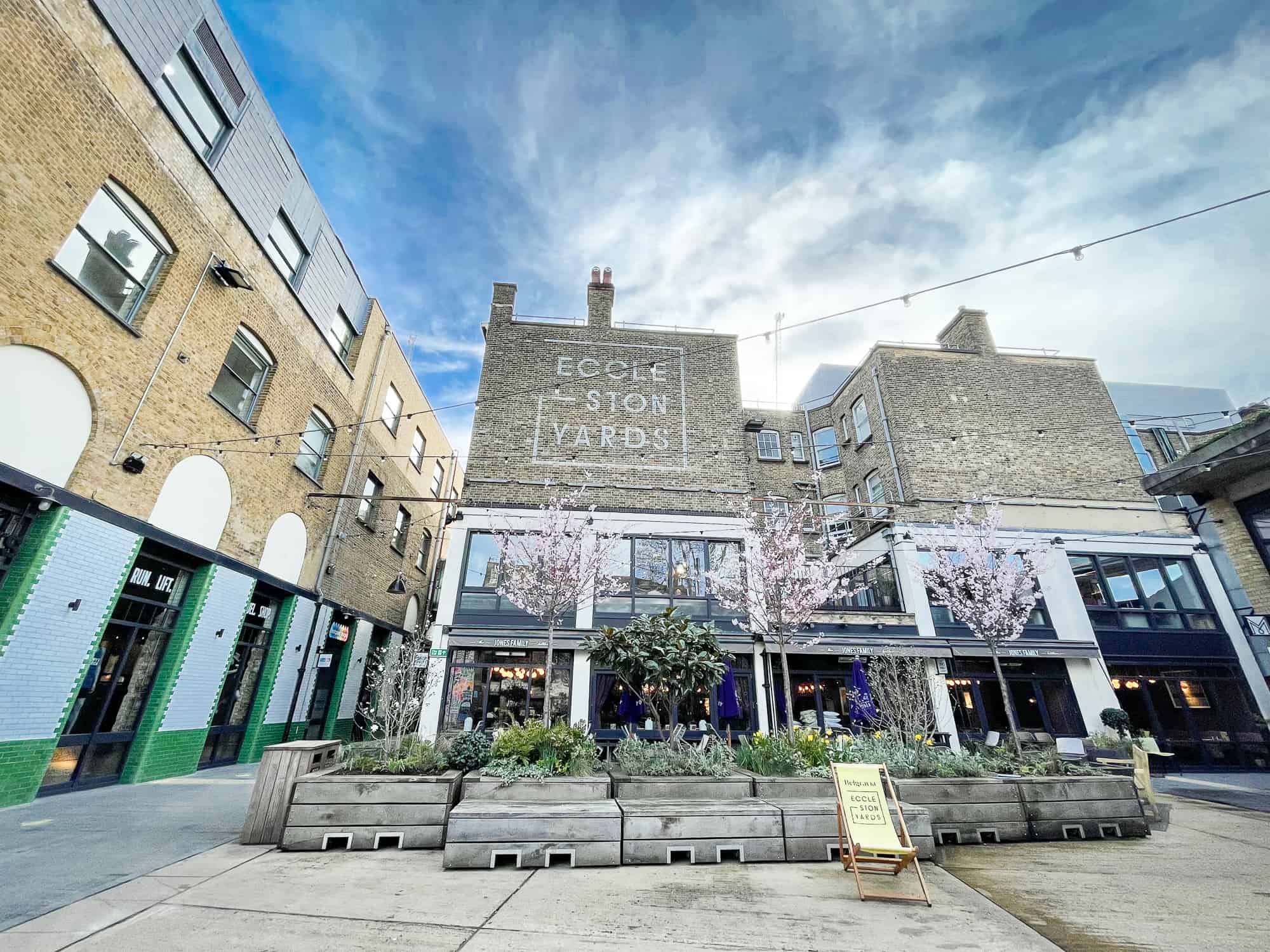 For a slightly different vibe to the white stucco and inky black railing look, take a tour into Eccleston Yards. Mixing brown bricks and twinkling lights beneath an open sky, you’ll find yoga classes, independent shops, cherry blossom, cafes, and sunshine yellow deckchairs. The zone includes London’s first meditation centre and even an open air market on Sundays.
