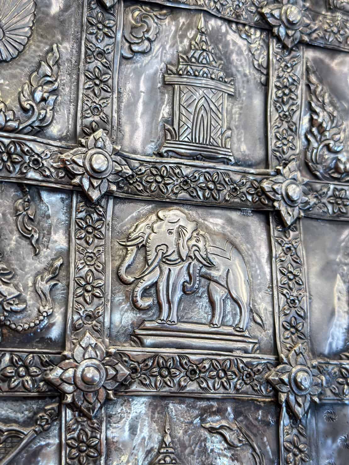 Silverwork at the Doi Silver Museum in Nan Thailand - features temples and elephants in a decorative grid
