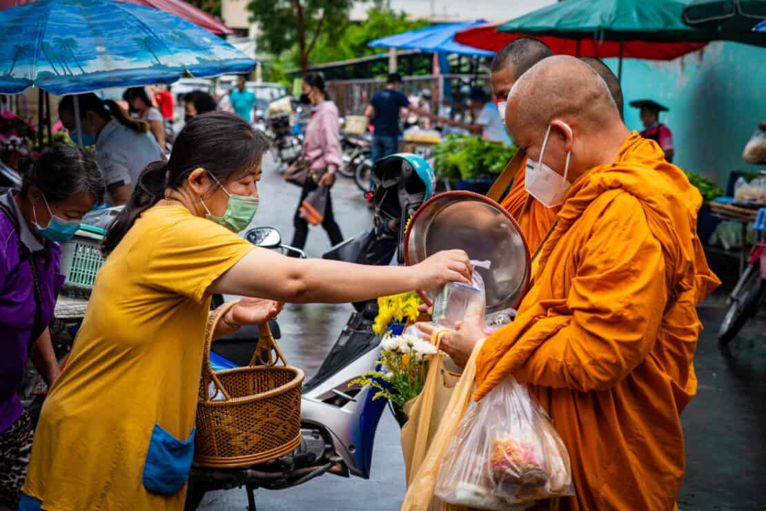 Having placed the goods into the alms pot that the monks hold, you then dip your head or drop to your knees to receive a blessing through a prayer.