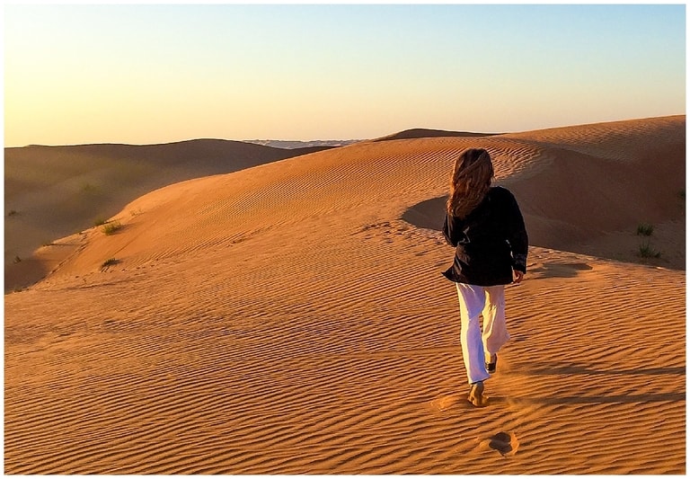 An oryx, I think, white flanks caked in dust, horns piercing the air. It’s almost as though she’s following the sun, appearing with its quiet, dawn-like shift across the dunes.