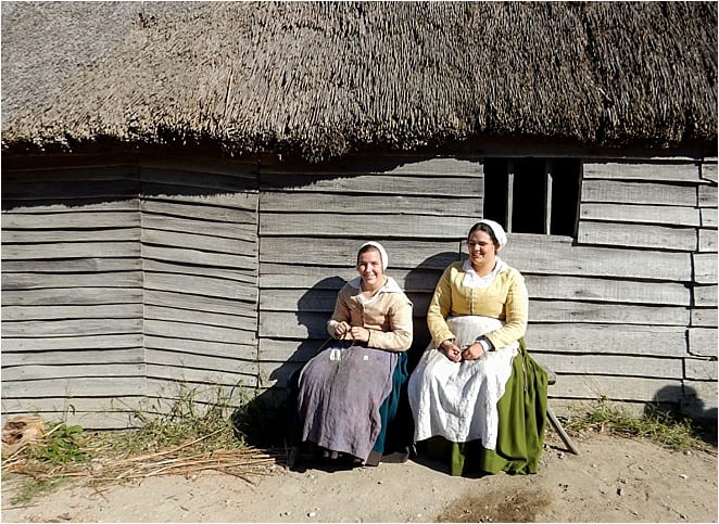Costumed actors stroll elegantly through the Plymouth Colony (a 17th century English village) waxing lyrical about how they came to this land – and suggesting I flirt with some soldiers down the hill.