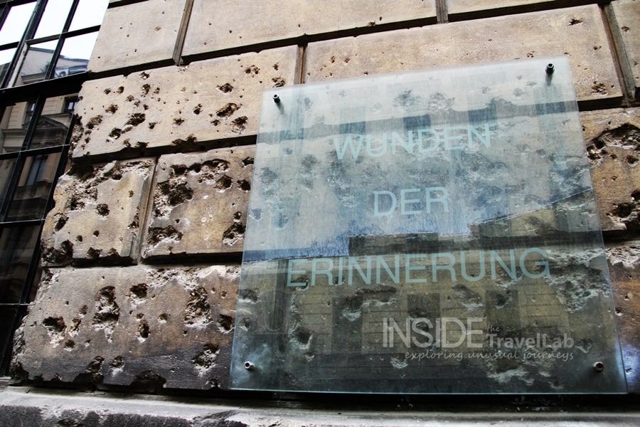 It’s located just outside the royal city centre, on a quiet side street lined with cars. It bears a sign that reads Wunden der Erinnerung and the stone is pockmarked at around head height.