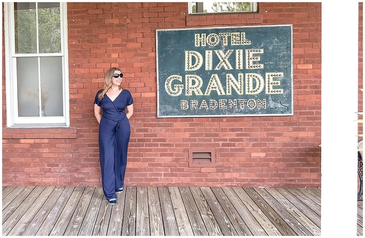 Abigail King stands outside Dixie Grande sign in Bradenton, Florida Gulf Coast