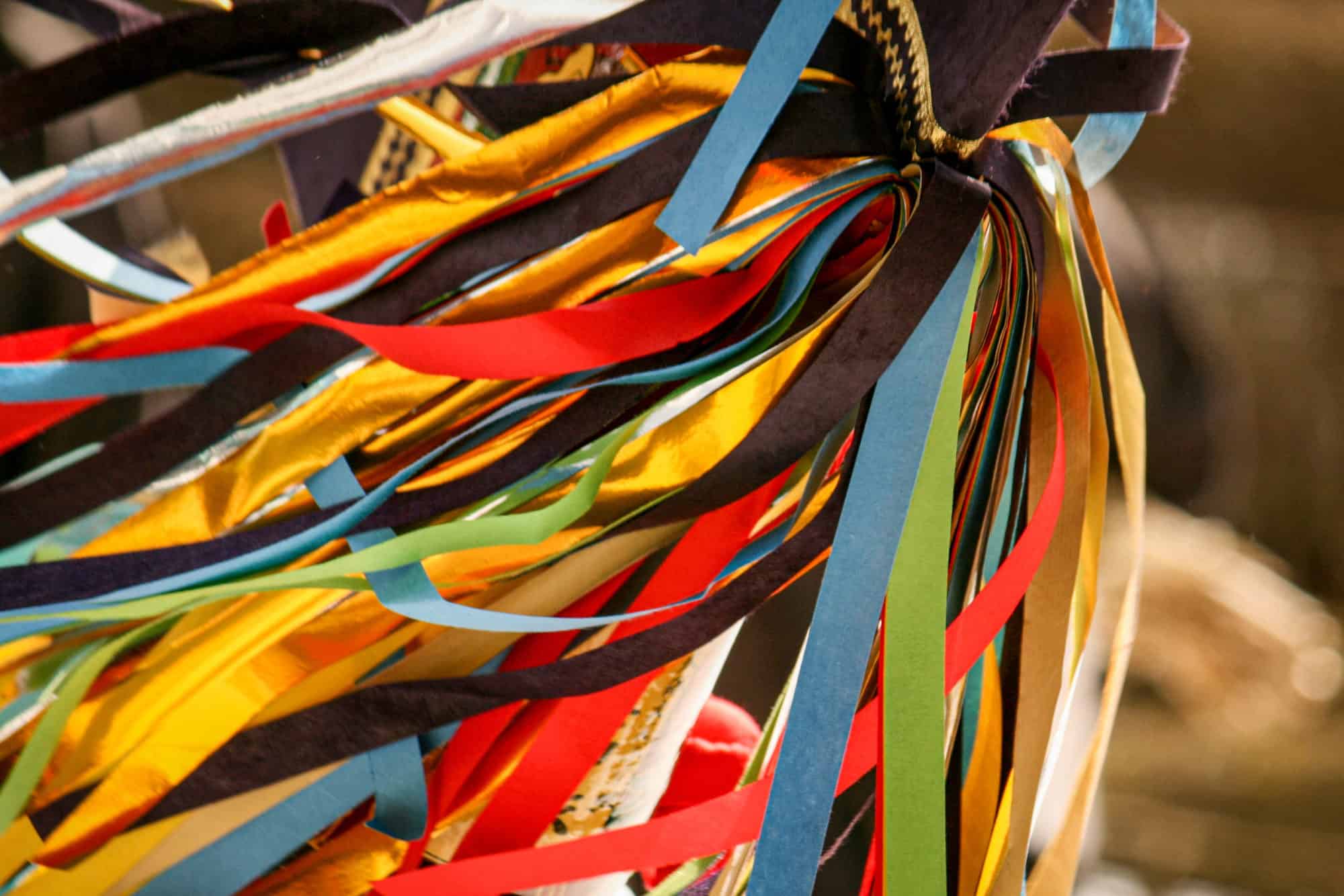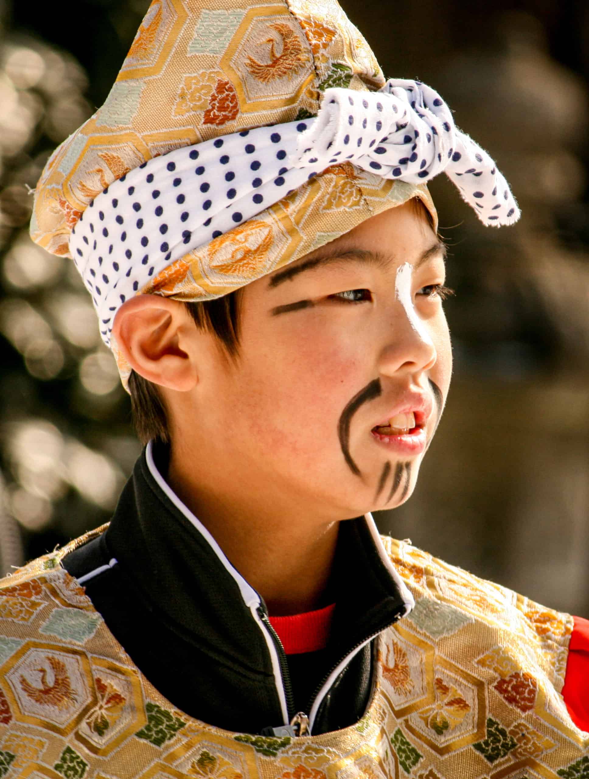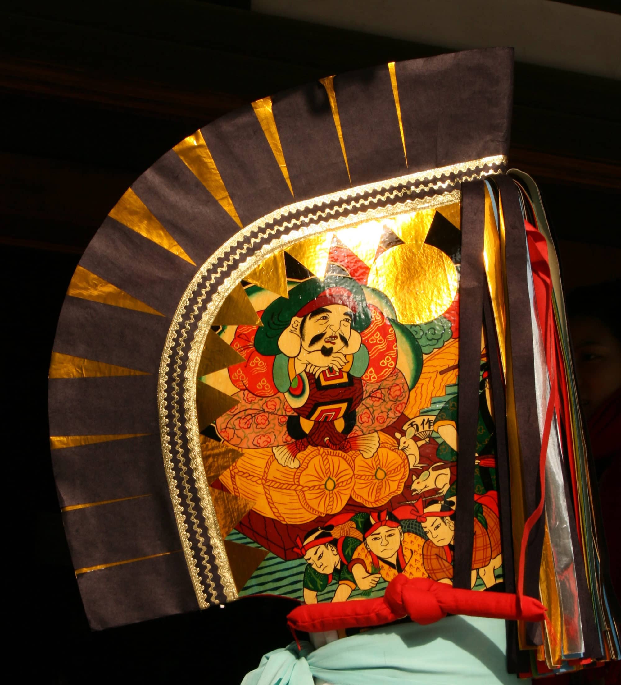 Dancers called tayu wear the flamboyant rainbow headdresses called eboshi. The ritual of scraping the earth through dance is believed to awaken the gods of the fields after their winter hibernation and encourage them to, you know, get back to work and make things grow again.
