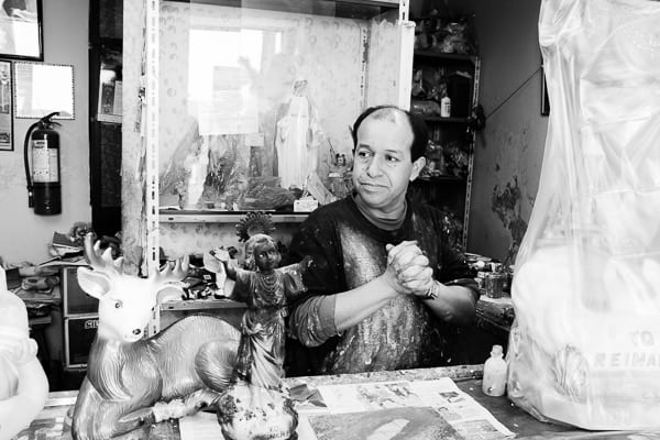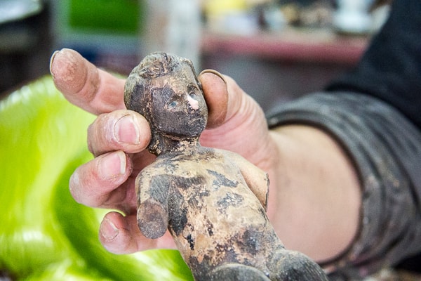 The paintbrush moves slowly across one. It pauses while the artist shows me other figures – Jesus with moving eyes, a decapitated Virgin Mary and a burned-beyond-recognition baby Jesus requiring the soot be scraped from upon him.