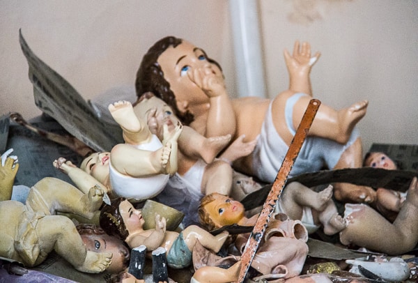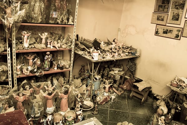 Virgin heads, cherub wings, and lots of baby Jesuses lie one atop the other in a scene of crazy carnage while one or two in particular sit on the counter top ready for repair.