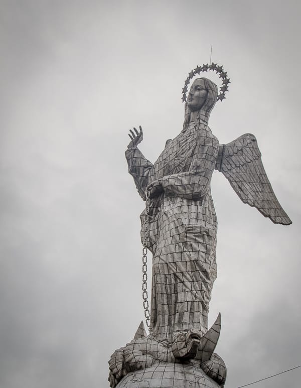 Stars dance around her crown, a chained dragon cowers by her feet and the swirling clouds of Ecuador shift and mask the house-layered hillsides of Quito, the highest capital in the world.
