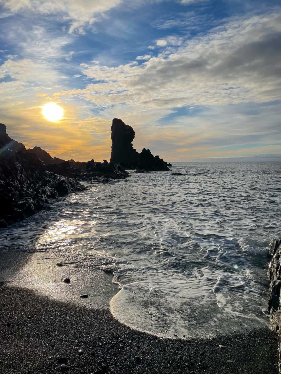 Iceland-Snaefellsness-Peninsula-Black-sand-beach-with-sunset