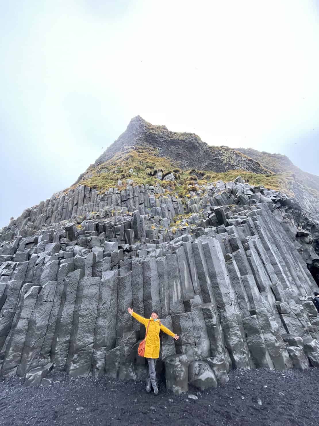 Woman in yellow coat against black rocks in Iceland bucket list trip