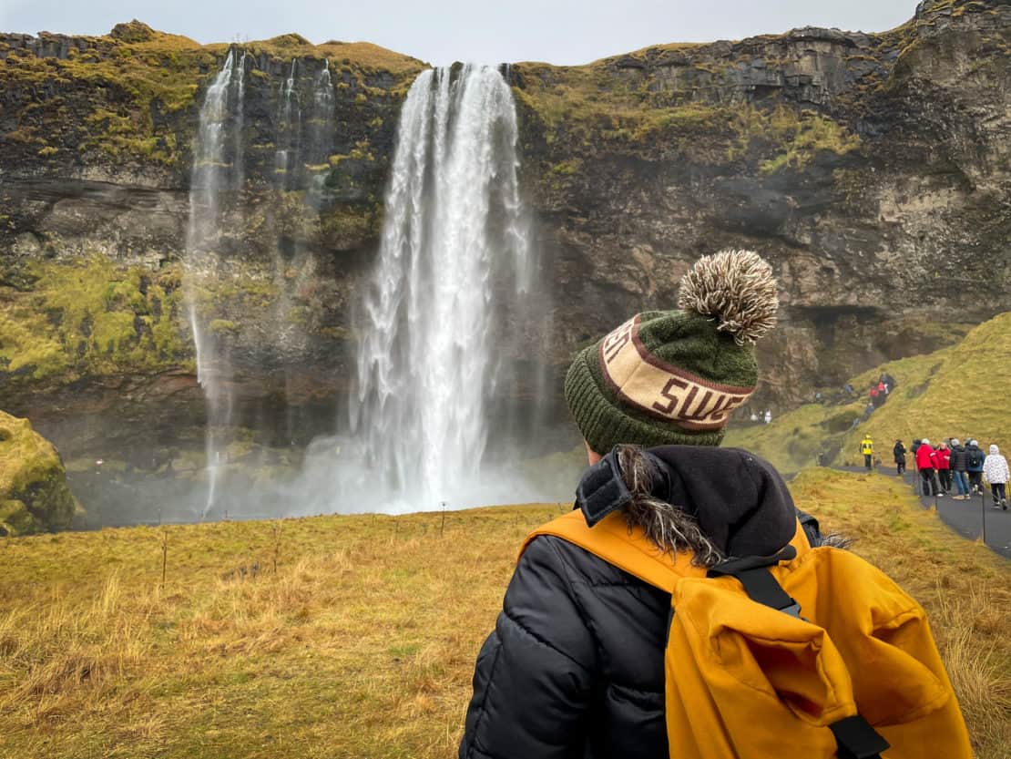 A little further along, it’s just a small detour to Seljalandsfoss waterfall. If clothes and time permits, you can walk behind the water and then warm up with a hot drink from one of the little kiosks near by.