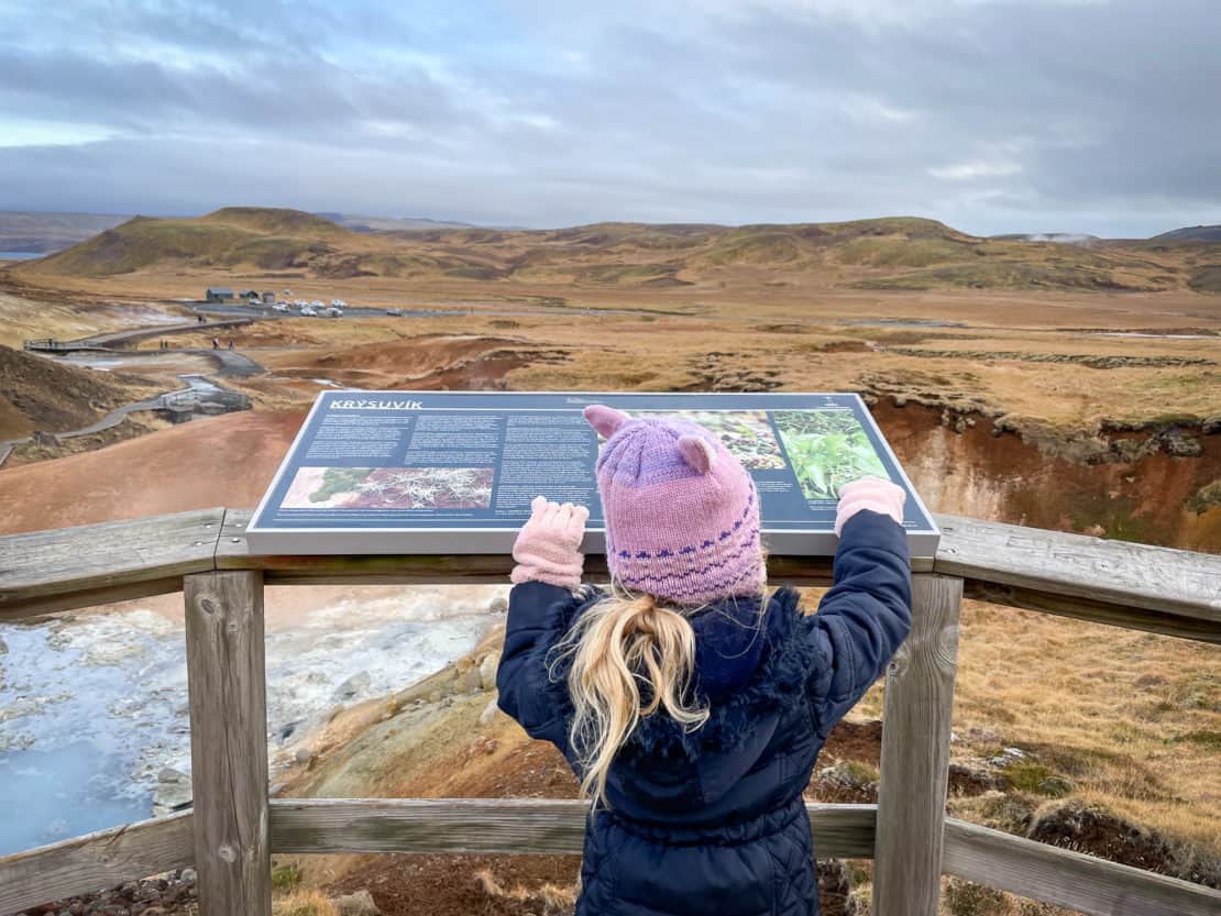 Depending on your flight time and the availability of appointment slots at the Blue Lagoon, you may just have time to drive and visit the Krysuvik Geothermal area. Full of volcanic vents, steam, crystals and colourful changes in the rocks, it’s a fun little add on to this part of your Iceland itinerary with kids.
