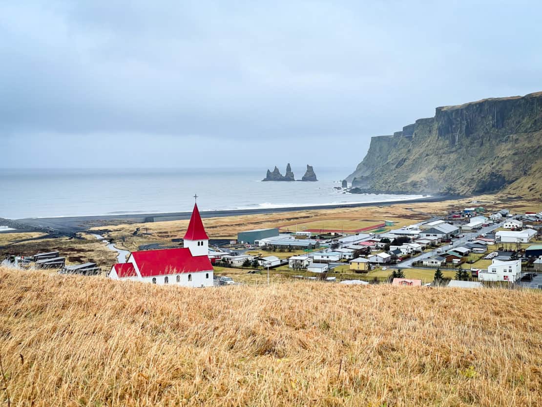 As you enter Vik, you will immediately spot Reyniskirkja Church with its white exterior and red roof specific to all Icelandic churches. It is surrounded by cliffs, volcanos, and glaciers and overlooks the black shores of the Atlantic and the small community living on the coast.