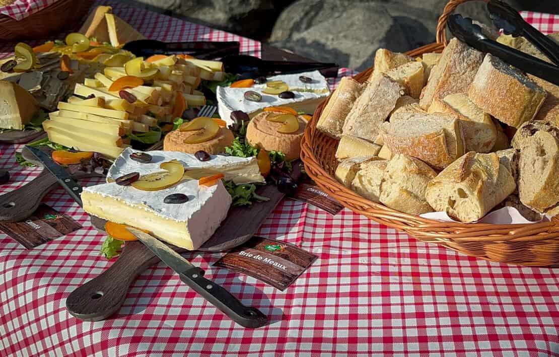 Platter of cheese and bread on a picnic blanket at Parc Asterix in France - Is Parc Asterix Worth Visiting?