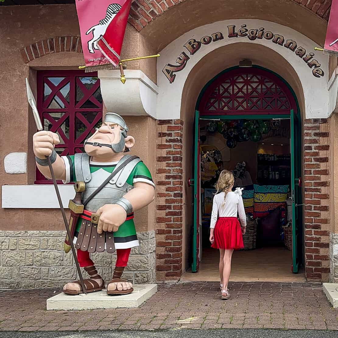 Child walking into a shop guarded by a Roman centurion character at Parc Asterix in France - Is Parc Asterix Worth Visiting?