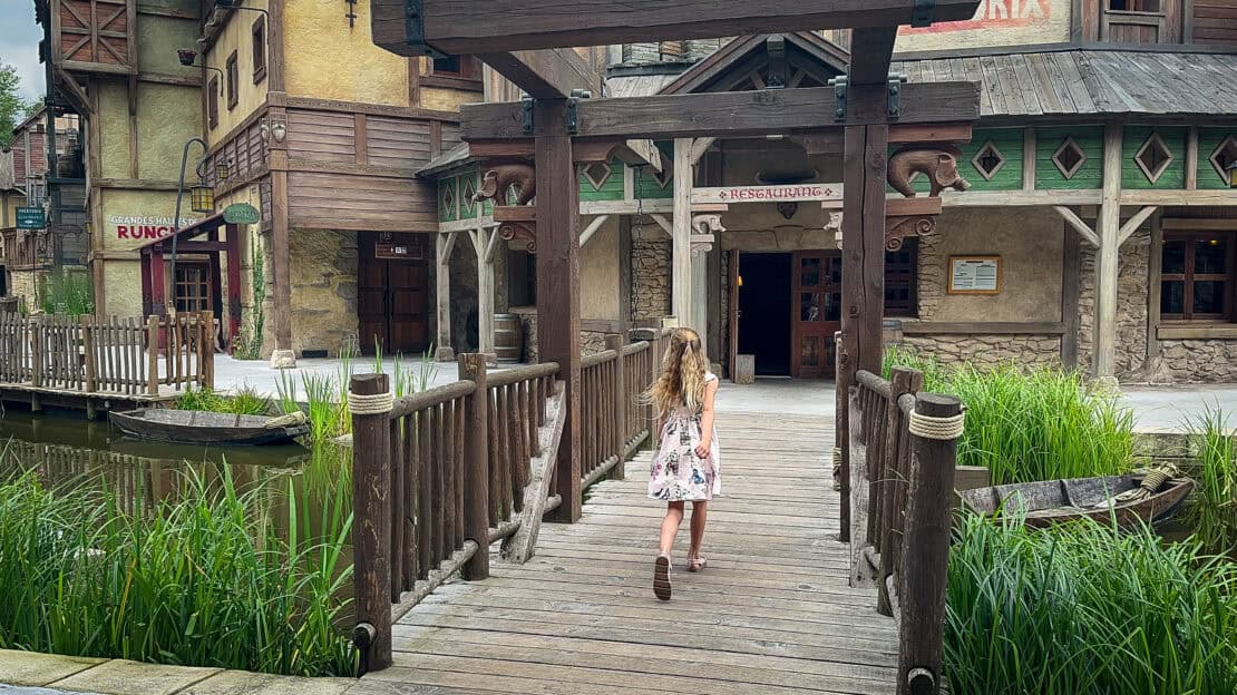 Girl walking towards her hotel at Parc Asterix in Paris, France - Is Parc Asterix Worth Visiting?