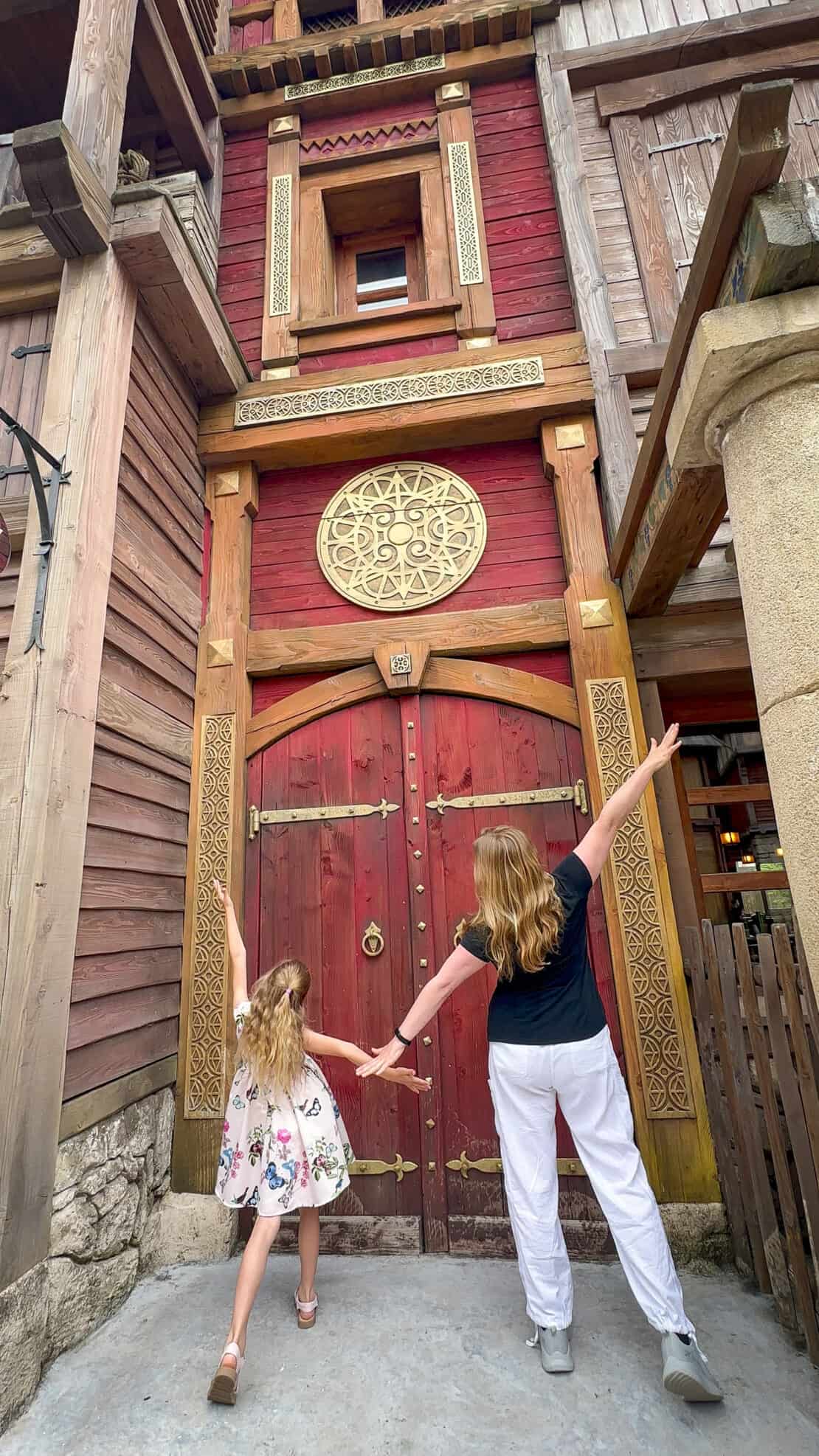 Mother and daughter outside an ornate red gate  at Parc Asterix in France - Is Parc Asterix Worth Visiting?