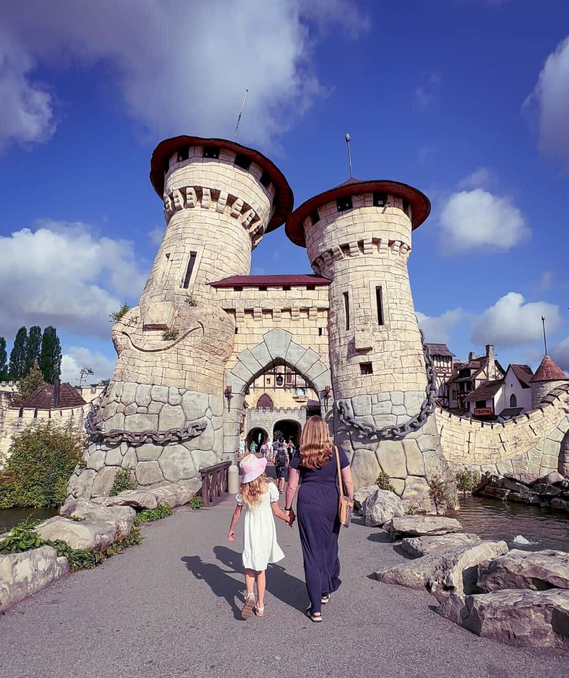 Mother and daughter walking towards the castle at Parc Asterix in France - Is Parc Asterix Worth Visiting?