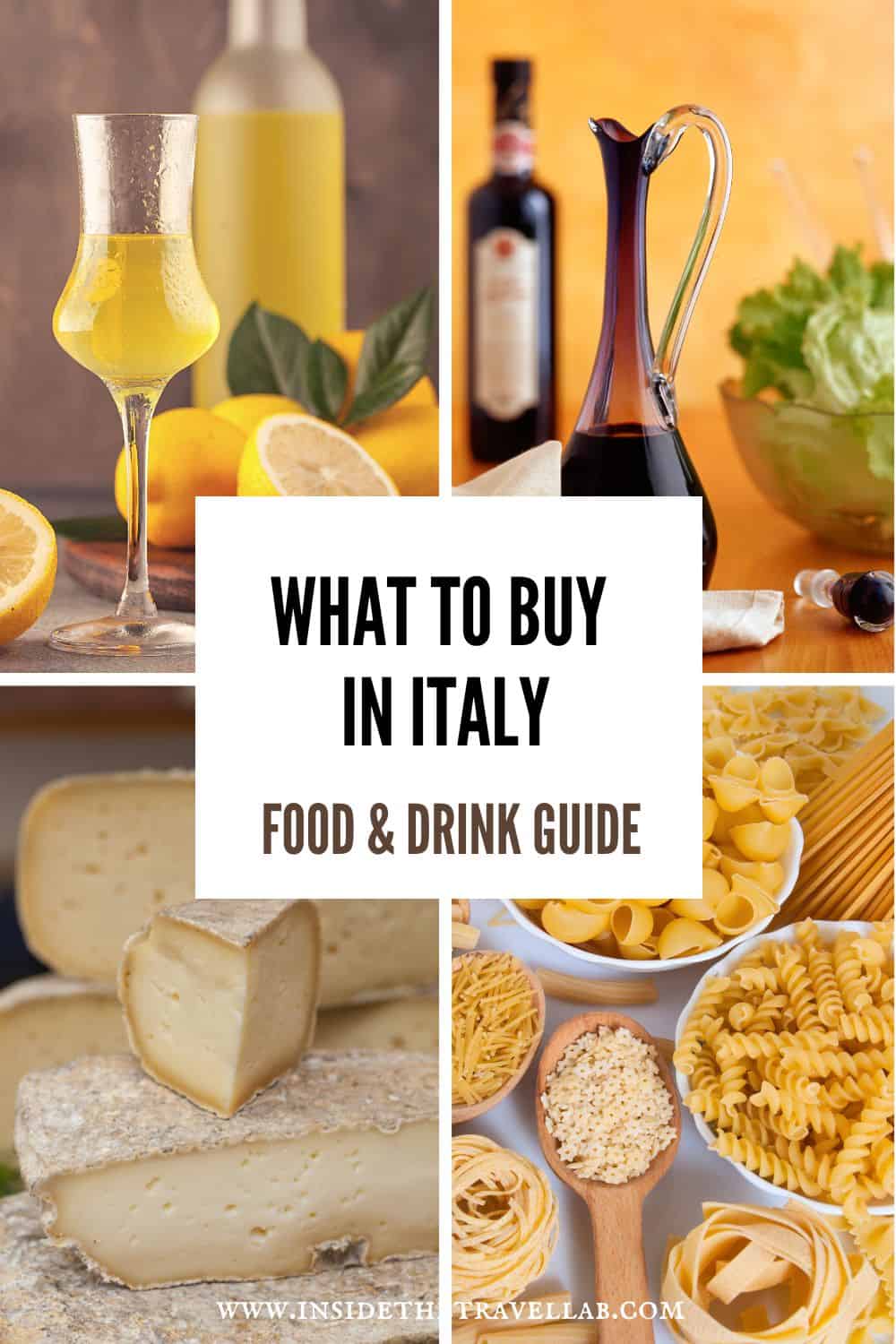 Collage of Italian food and drink products which you can bring back from Italy including limoncello, balsamic vinegar, pasta and Italian cheese.