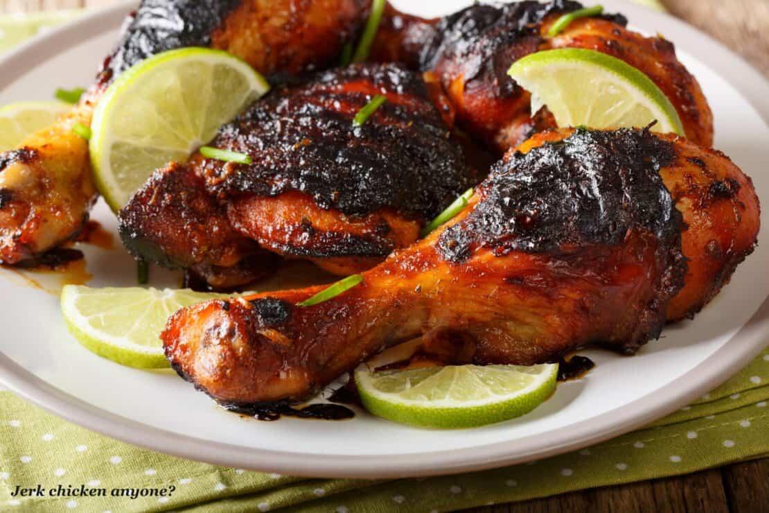 Jerk chicken drumsticks with lime wedges - Jamaica vs Barbados