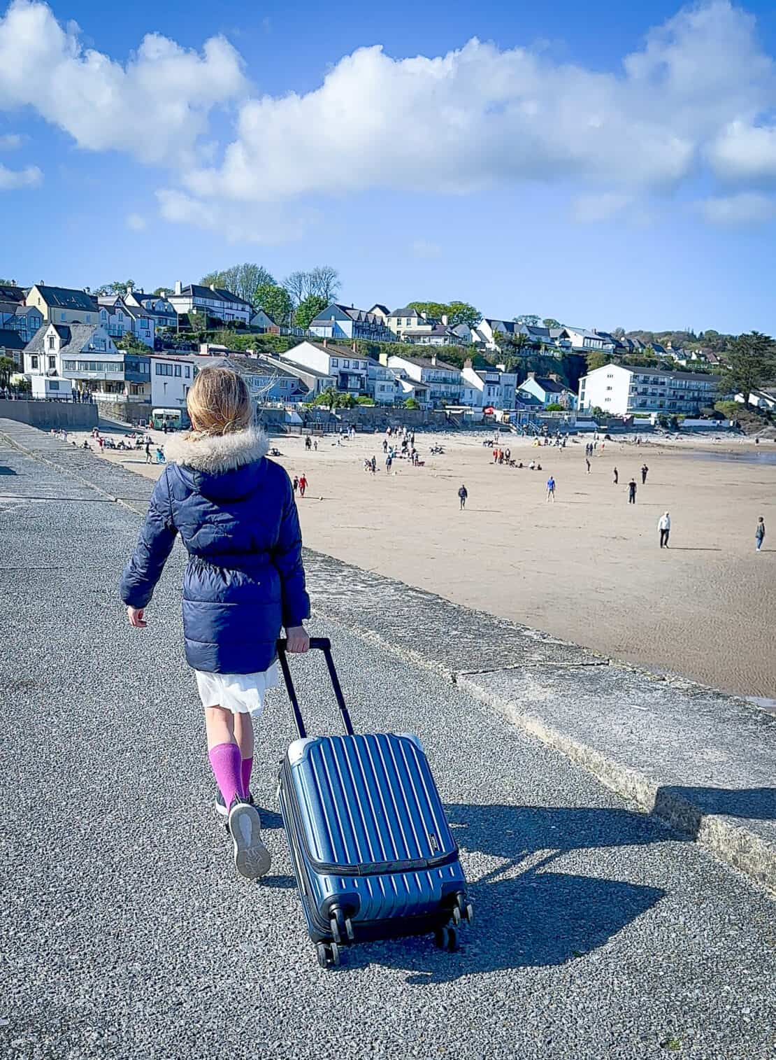 Child pulling a blue suitcase along a beach -  Level 8 Grace luggage review