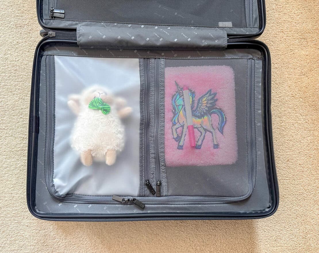 Children's toys inside the zipped compartment of a Level8 suitcase