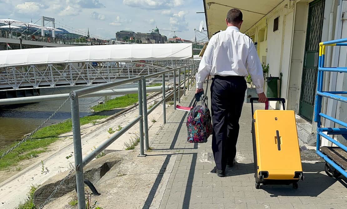 Baggage handler wheels the Level8 suitcase along the river, level8 luggage review