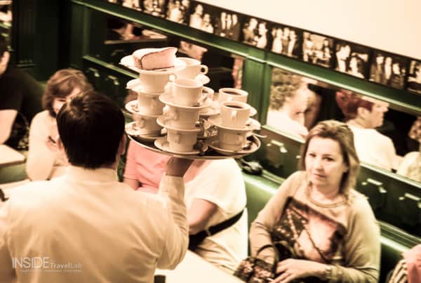But the atmosphere inside defies dull: waiters dart and dive between the crowds with a wedding cake of white cups wobbling with wild abandon as the Sunday morning chatter bounces left and right and up and down and in and out and back again from mirrored walls and ceramic tiles.