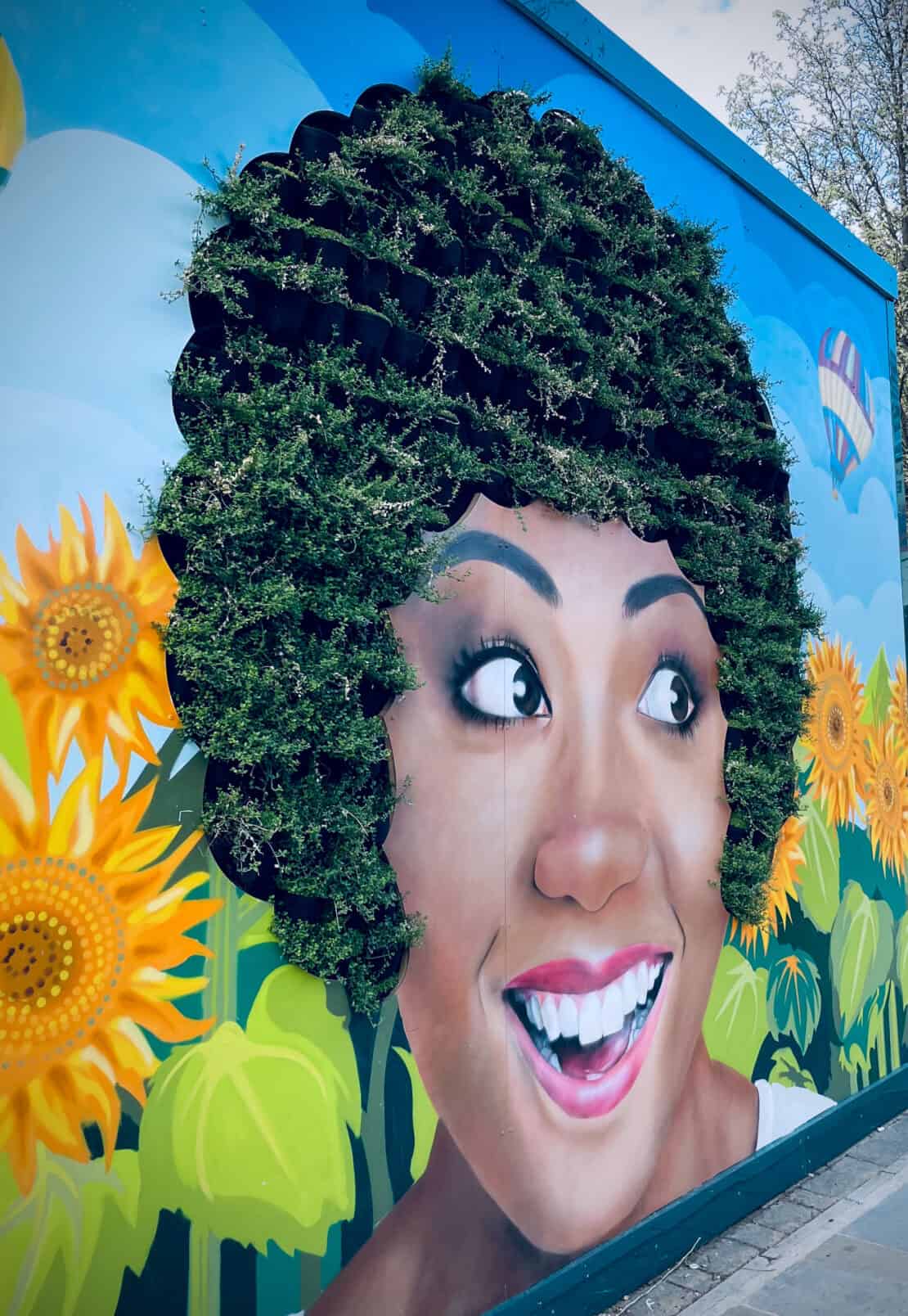 Cool street art in London where plants make up a woman's hair
