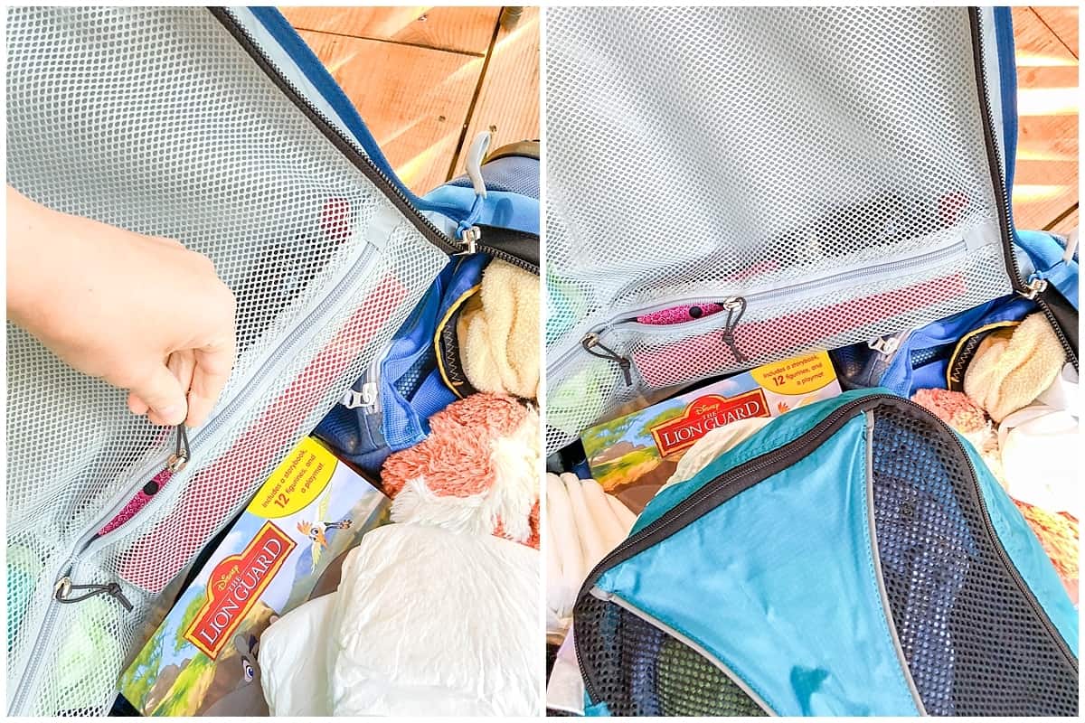Inside, the part that folds out to let you in to the main compartment contains two meshed, zippable compartments so you can stash quick access goods there too.