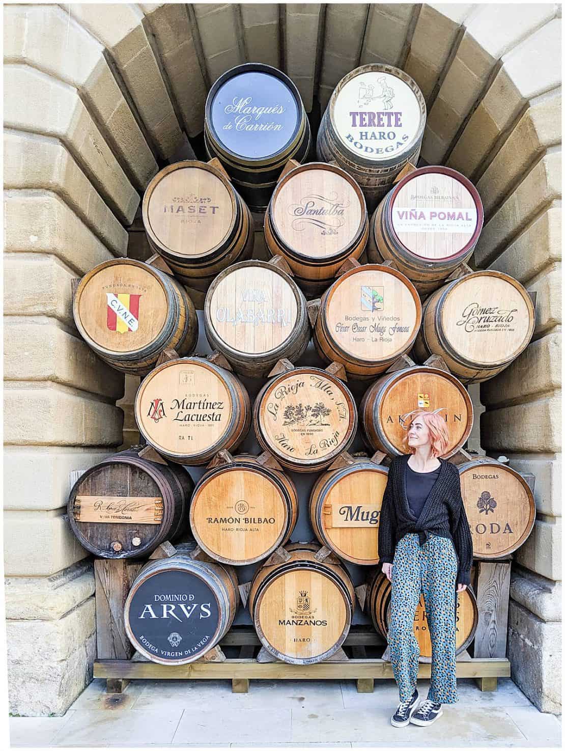 Spain - La Rioja - Haro - woman standing in front of barrels