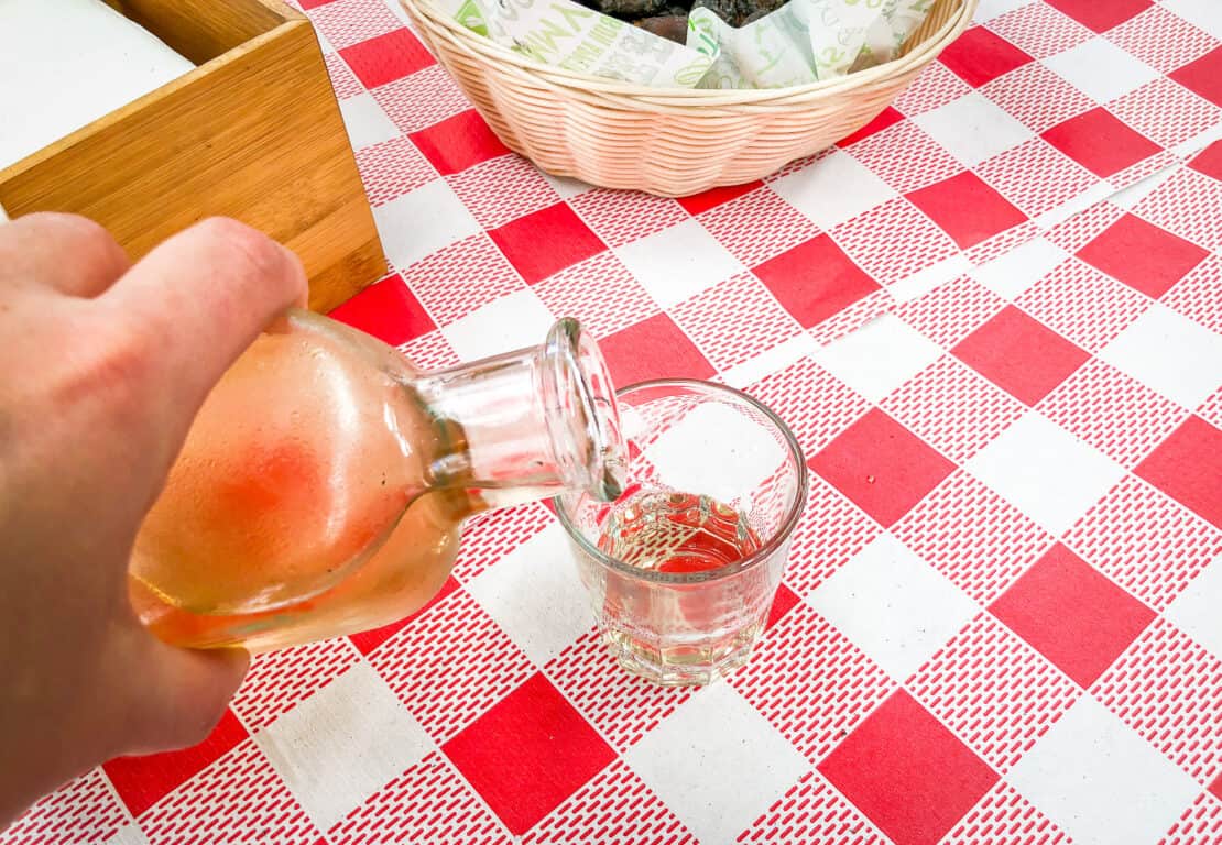 White wine poured from a carafe into a glass on a traditional table top in Tenerife