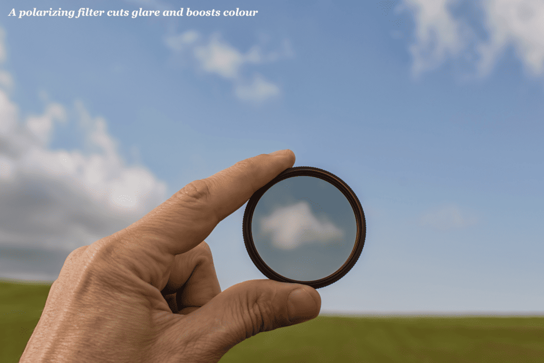 A polarizing filter is essential for cutting glare and boosting colour saturation in bright conditions.