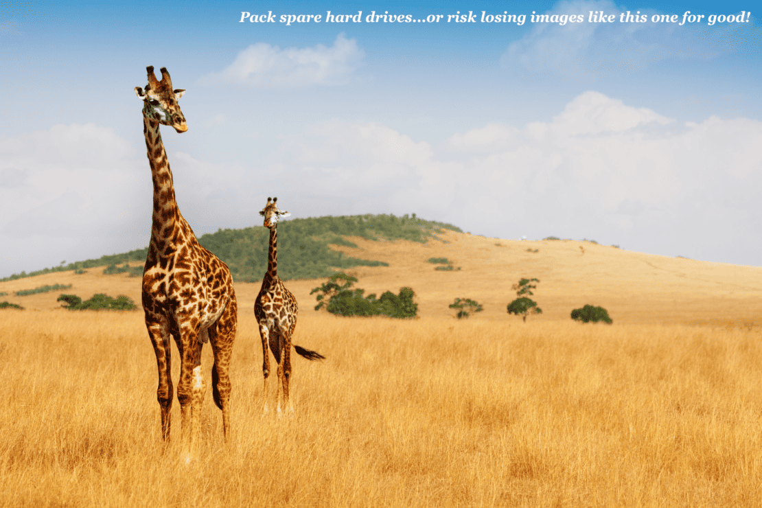 The dust and humidity of the savannah can wreak havoc on electronics, so be sure to bring protective covers for your laptop and drives.