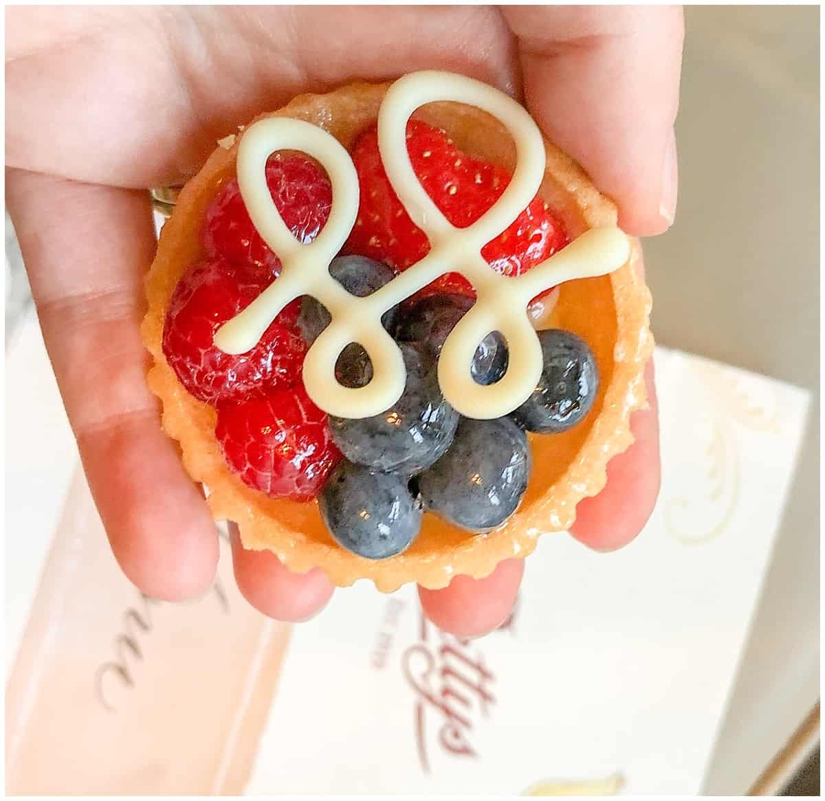 The traditional afternoon tea comes with four triangular sandwiches (cucumber, salmon, coronation chicken and a mystery surprise), the scone and three small sweets. For me, this involved a chocolate cake, glazed fruit tart and lemon and orange zested macaron.