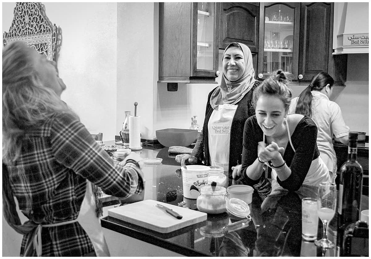 Maria, who I met last time, moves at about twice my speed and speaks at about thrice my volume despite being half my size. Last time, we sliced and spliced indoors, this time we join a group of around twenty Jordanian women (with a few men late and lurking in the shadows.) Our driver and guide, Basil and Hatem, however, don’t appear to be so shy. They roll up their sleeves and critique my technique for knife meets onion before taking over and doing a better job of it themselves. It is a wonderful exploration of Jordanian food.