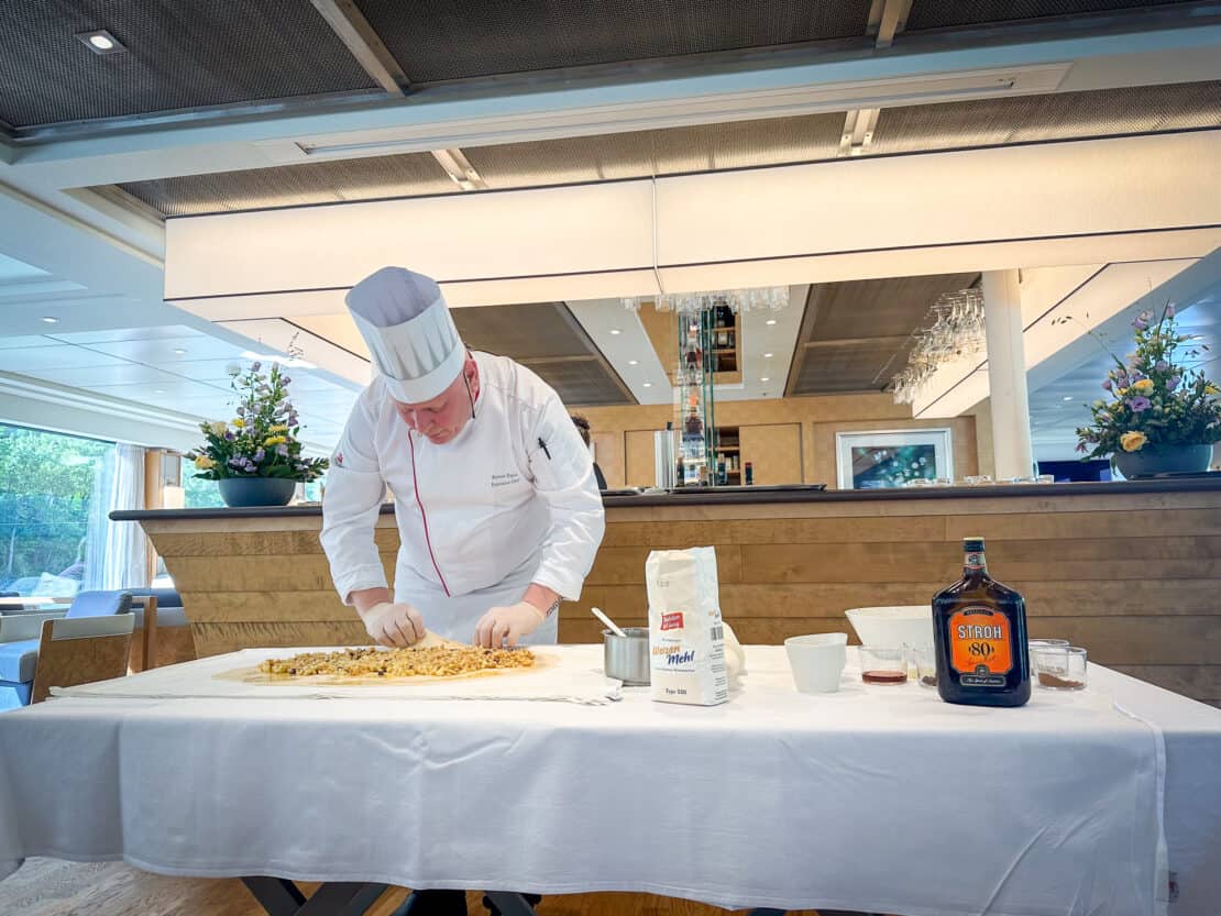 There’s also an on board cooking lesson, in this case an apple strudel recipe while floating away from Vienna.